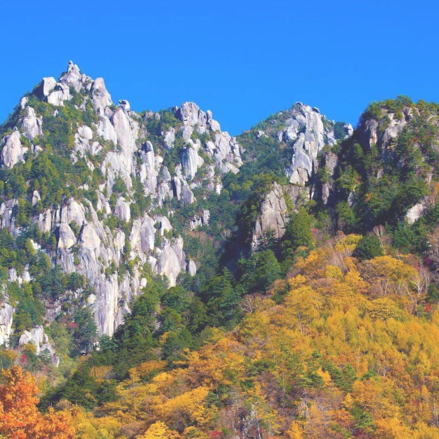 まるで、のこぎりのような独特のギザギザ頭は、今から2万年以上も昔の火山活動の名残で、その大小様々な形の岩が切り立つ山頂は奇峰の名にふさわしい、ヤスリ岩、弘法岩、十一面岩などの名前がつけられています。(みずがき→神社の周囲にめぐらす垣根のこと。)